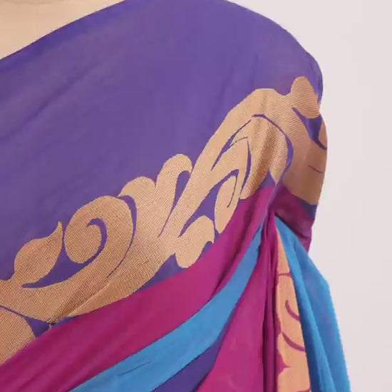 Blue Chettinad Cotton Saree with Pink & Purple Borders