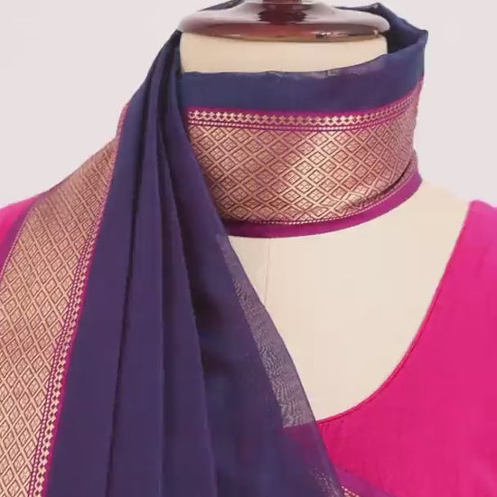 Graceful and rooted in tradition, this handwoven blue Maheshwari cotton silk saree brings together royal elegance and playful contrast. The rich blue body is complemented by a contrasting pink border woven with zari, showcasing the signature bugdi weave—reversible and refined.