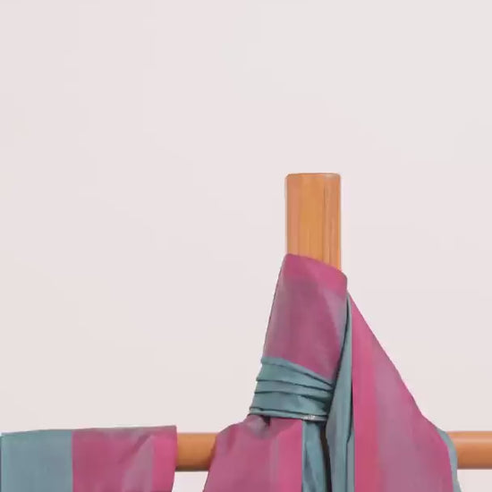 Crafted from natural banana fibres, this handwoven saree beautifully blends sustainability with elegance. The striking dual tone of pink and blue adds a vibrant visual depth, while the contrasting pink pallu brings a festive richness to the drape.
