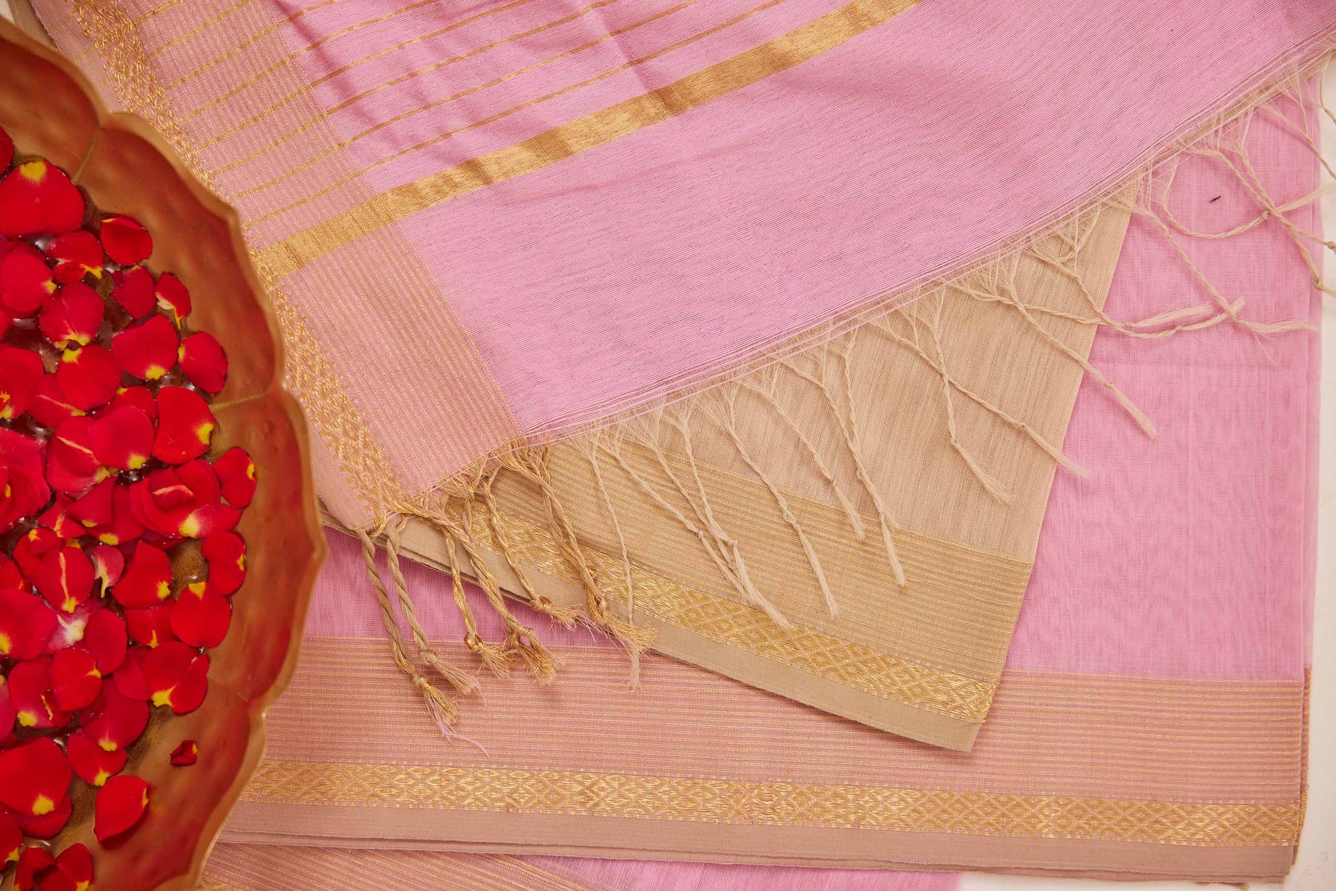 Maheshwari Cotton Silk Dress Material – Pink with Gold Zari Border & Beige-Pink Dupatta
