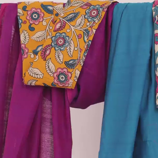 • Inclusions: Two blouse pieces – plain purple & yellow block print cotton
