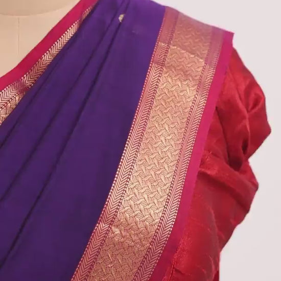 Purple Maheshwari Cotton Silk Saree with Gold Buttas & Red Zari Border