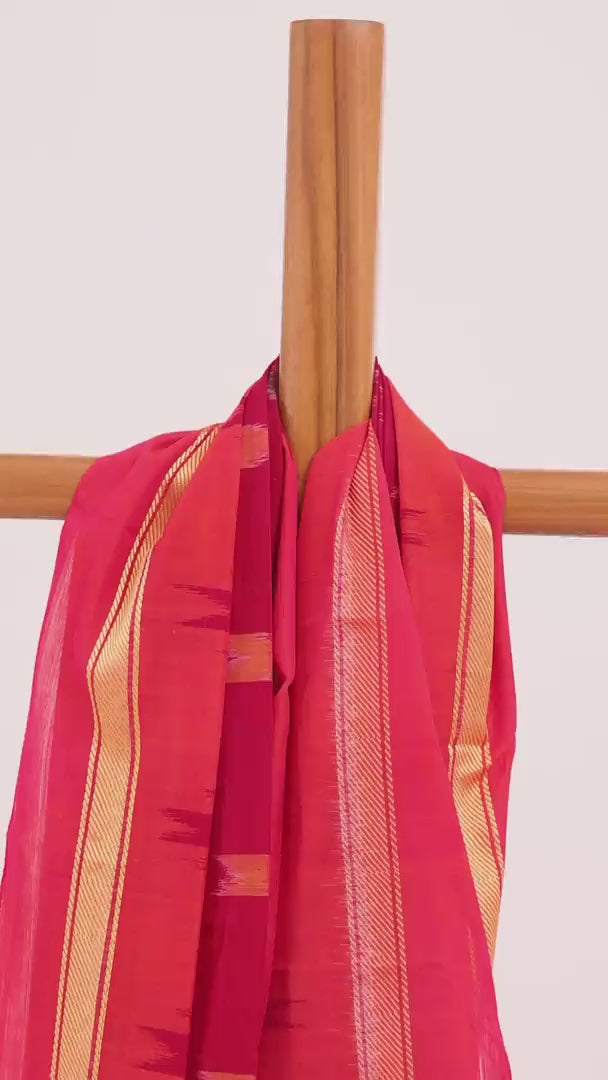 Woven by skilled artisans in Bhoodan Pochampally, this saree uses the intricate Telia double Ikat technique, where each yarn is first treated with castor oil and ash, then resist-dyed before weaving. The result? A fabric that’s deeply coloured, softly textured, and beautifully symmetrical.