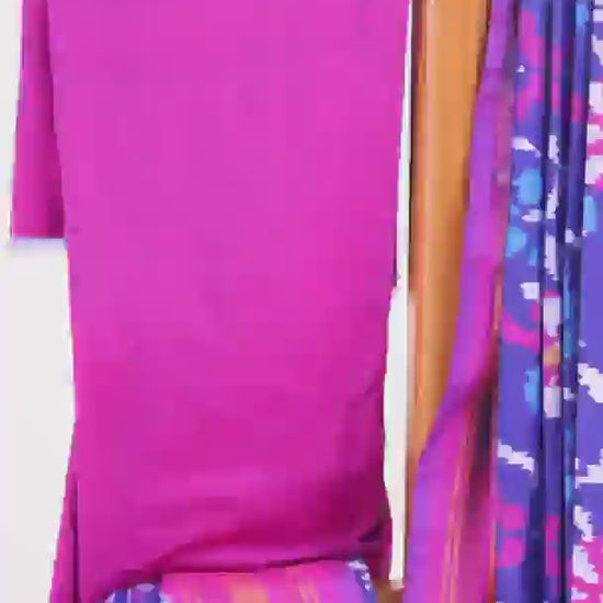 Elegant yet vibrant, this royal blue and magenta Pochampally silk saree brings a refreshing take on heritage weaving. Adorned with delicate floral Ikat motifs, the deep blue body offers poise, while the magenta pallu and border add a burst of colour and celebratory charm.